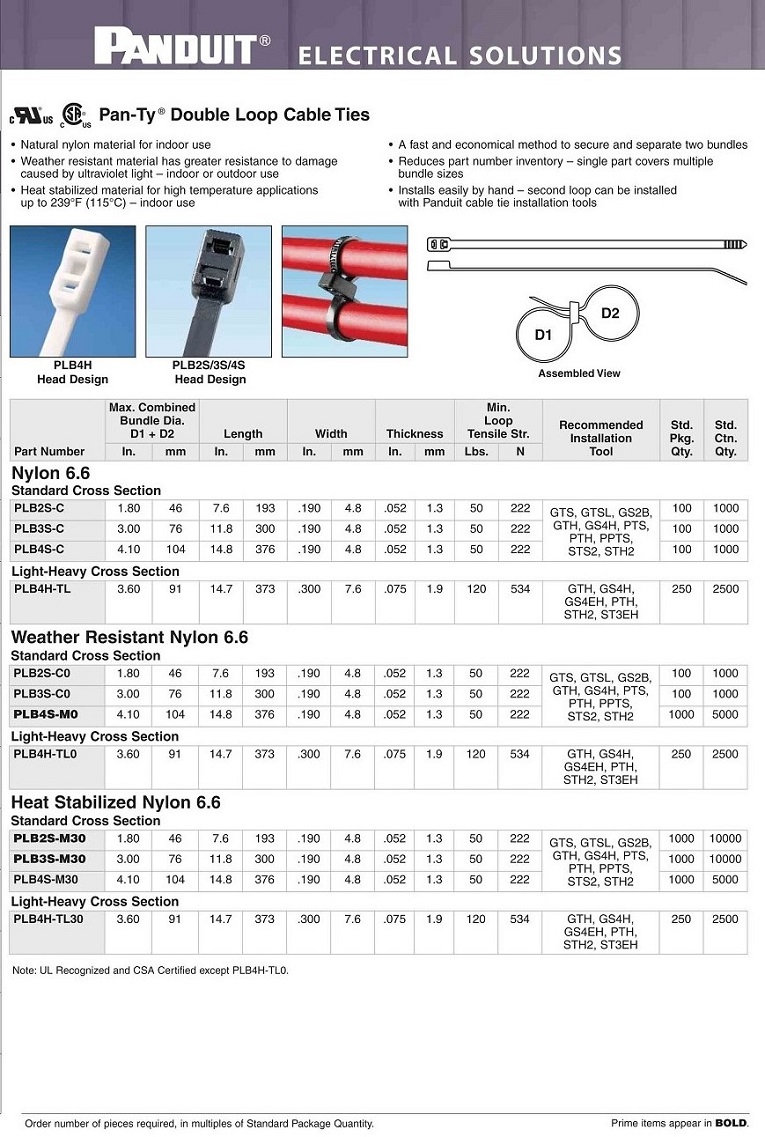 泛達(dá)(PANDUIT) 尼龍6.6 雙環(huán)路線纜扎帶 PLB2S-M0, PLB3S-M0, PLB4S-M0, PLB4H-TL0