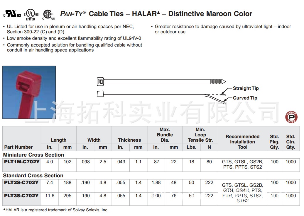 PANDUIT(泛達)HALAR 三氟氯乙烯線纜扎帶 PLT1M-M702Y, PLT2S-C702Y, PLT3S-M702Y