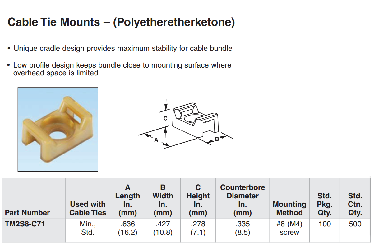 • 適用于電纜扎帶材料的惡劣環(huán)境,能承受化學或輻射暴露 • 非導電材料,適用于高溫,應用溫度高達500°F(260°C) • 在很寬的溫度范圍內(nèi)具有高強度性能。 • UL 94V-0的可燃性等級,具有低煙和低毒性,無鹵。 • PEEK材料符合MIL規(guī)范MIL-P-46183,并被美國國防部批準使用。 • 一體式結(jié)構(gòu),性能和可靠性始終如一。 • 業(yè)內(nèi)任何一體式電纜扎帶的最小穿線力。