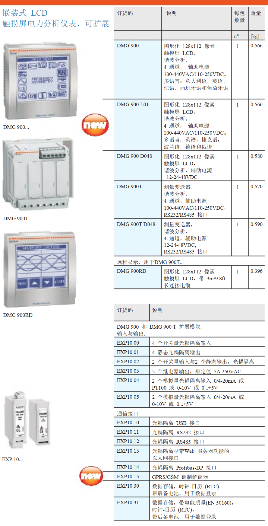 DMG 900電表 可擴(kuò)展型數(shù)字式電力分析儀表采用嵌入式安裝外殼,尺寸為 96x96mm/3.8x3.8in。其寬型圖形化觸摸屏顯示器提供了儀表與用戶之間的極為簡便的互動(dòng)。高性能的電力分析儀表給出非常精確的測(cè)量,并且可以監(jiān)控配電系統(tǒng)以檢測(cè)和防止發(fā)生危害質(zhì)量和供電的電能問題。 主要特性包括寬闊的電源電壓的范圍,高測(cè)量精度,可擴(kuò)展性,最多至4個(gè)接插式擴(kuò)展模塊。此外,還有 DMG 900T 測(cè)量變送器,可以與 DMG 900RD遠(yuǎn)程顯示器組合應(yīng)用。 DMG 900T,不帶顯示,用于安裝在配電柜內(nèi)部, 35mm DIN 導(dǎo)軌上,對(duì)于各個(gè)多功能儀表的測(cè)量值必須遠(yuǎn)程查看的電力系統(tǒng)是一個(gè)理想的解決方案。與DMG900T 變送器連接的DMG 900RD 遠(yuǎn)程顯示單元可以在面板上顯示測(cè)量值,而此時(shí)電力連接保持在電控柜內(nèi)部。 主要測(cè)量參數(shù)和功能包括:– 電壓:相電壓,線電壓及系統(tǒng)電壓(包括中性線對(duì)地電壓) – 電源電壓,僅適用于直流DC 供電型 – 電流:相電流 – 中性線電流計(jì)算值和真值 – 功率:視在功率,有功功率和無功功率,每相及總和 – 功率因數(shù):功率因數(shù),每相及總和 – Cosϕ 每相及總和 – 所測(cè)取電壓的頻率 – 電壓和電流的對(duì)稱性 – 總諧波畸變率 (THD): 電壓和電流 – 最大至63次的電壓和電流的諧波分析 – 高值-低值-平均值功能,適用于所有的測(cè)量值 – 功率和電流的最大需求值 – 諧波電量的流向 – 電度表用于計(jì)量有功功率,無功功率,視在功率,分計(jì)及總計(jì),支持可設(shè)置電價(jià)功能 – 計(jì)時(shí)器,用于設(shè)置總計(jì)和分計(jì)時(shí)間 – 通用型脈沖計(jì)數(shù)器: 可用于水,燃?xì)猓认?/span>的脈沖計(jì)數(shù),僅限使用擴(kuò)展模塊 – 根據(jù)EN 50160 的電能質(zhì)量分析,僅限使用擴(kuò)展模塊。 工作特性: – 輔助電源電壓范圍: 90-484VAC / 93.5-300VDC 適用于 DMG 900 和DMG 900T; 9-70VDC 適用于 DMG 900 D048 和 DMG 900T D048 – 電壓測(cè)量范圍: 20-830VAC 線電壓 10-480VAC 相電壓 – 采用電壓互感器可以在中壓和高壓系統(tǒng)中使用– 額定輸入電流: 5A 或 1A 經(jīng)由電流互感器CT – 電流測(cè)量范圍: 0.01-10A 或 0.002-1.2A – 電流測(cè)量范圍,采用電流互感器CT,最大至10,000A – 頻率測(cè)量范圍: 45-66Hz / 360-440Hz – 真均方根RMS 測(cè)量:用于電壓和電流 – 精度: • 電壓: ±0.2% (50-830VAC) • 電流: ±0.2% (0.1-1.1In) • 功率: ±0.5% f.s. • 功率因數(shù): ±0.5% • 頻率: ±0.05% • 有功電度: 0.5S 級(jí) (IEC/EN 62053-22) • 無功電度: 2 級(jí) (IEC/EN 62053-23) – 非揮發(fā)記憶儲(chǔ)存器用于數(shù)據(jù)和事件(最近100件)存儲(chǔ) – 通信規(guī)約 Modbus ![]() TCP,只支持采用通信擴(kuò)展模塊 – 通過軟件的程序和遠(yuǎn)程控制,只支持采用通信控制模塊 – 外殼: • 嵌入式安裝 96x96mm/3.8x3.8in 適用于 DMG900... 和 DMG 900RD • 35mm DIN 導(dǎo)軌 (IEC/EN 60715) 固定適用于 DMG 900T – IEC 防護(hù)等級(jí): IP65 正面,適用于DMG 900... 和 DMG 900RD; IP20 端子,適用于DMG 900... - DMG 900T