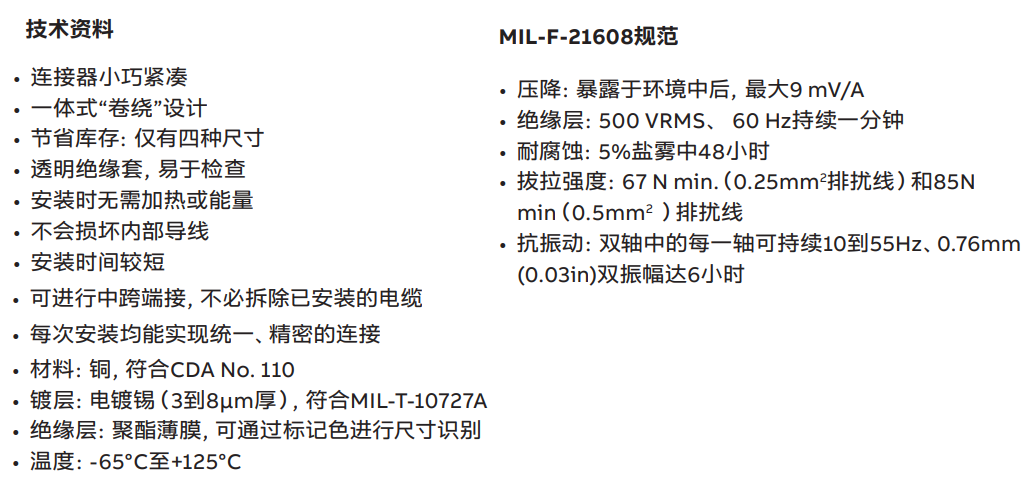在任何適合使用屏蔽電纜與導(dǎo)線的應(yīng)用場(chǎng)合,總是難以找到一種能夠長(zhǎng)久、可重復(fù)使用而又安全、快速的編織屏蔽連接。常規(guī)連接使用釬焊的方法,比較耗時(shí)且成本高,經(jīng)常會(huì)因熱量而造成介電質(zhì)或內(nèi)部屏蔽導(dǎo)線的損壞。而且,鉛焊接的方法也與最新的安全法規(guī)相沖突。 一體式設(shè)計(jì)連接器,用于無(wú)焊、環(huán)繞式壓接。開(kāi)放式設(shè)計(jì),允許跨中連接。安裝快速簡(jiǎn)單:無(wú)需加熱或供電,不會(huì)損壞內(nèi)部導(dǎo)體。透明聚酯絕緣,便于檢查。MIL規(guī)定(超過(guò)MIL-F-21608的性能要求)和行業(yè)認(rèn)可的技術(shù),非常適合在尺寸和重量很重要的飛機(jī)、航空航天和電子行業(yè)生產(chǎn)。